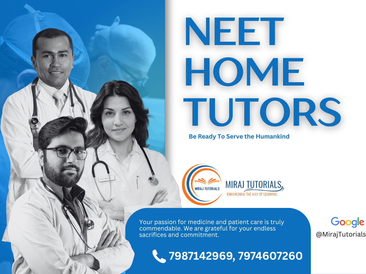 Miraj Tutorials is one of the most trusted names in Jabalpur for providing highly experienced and dedicated NEET tutors who specialize in delivering personalised home tuition for NEET aspirants. With a strong focus on clarity of concepts, Miraj Tutorials ensures that students build a solid foundation in Physics, Chemistry, and Biology, which is essential for scoring high in India’s toughest medical entrance exam. Our NEET home tutors follow a structured teaching plan that includes NCERT-based learning, in-depth explanation of every chapter, advanced problem-solving sessions, and daily practice assignments designed exactly on NEET exam patterns. Students receive one-to-one attention, which helps them understand difficult topics at their own pace, clear doubts instantly, and strengthen their weaker areas without any hesitation. At Miraj Tutorials, we conduct regular chapter-wise tests, full-length mock exams, and previous year question paper analysis to help students improve speed, accuracy, and time management. We provide well-prepared study material, revision notes, diagrams, formula sheets, and NEET-level question banks to make preparation more effective. Our tutors also guide students with exam strategies, topic prioritization, and performance tracking to ensure they remain confident and consistent throughout their NEET journey. With flexible class timings, expert faculty, and a result-oriented approach, Miraj Tutorials aims to turn every aspirant’s dream of becoming a doctor into reality. If you are looking for expert NEET tutors in Jabalpur who can provide top-quality home tuition and complete academic support, Miraj Tutorials is the ideal choice. Contact us today to book your NEET home tutor today and give your child the right guidance for success.