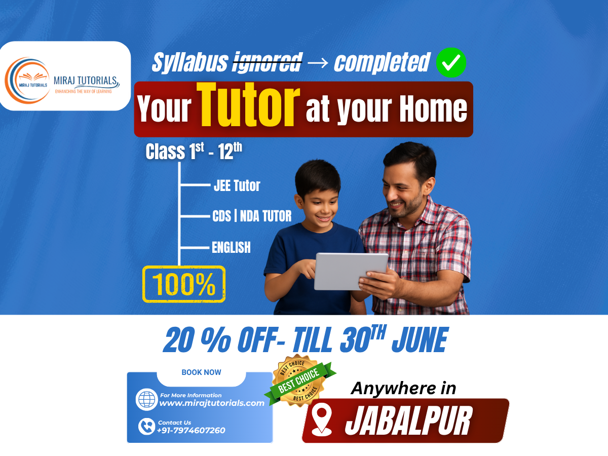 Every parent’s dream is to see their child succeed in academics, but the reality of crowded classrooms and fast-paced school teaching often makes this challenging. In such a scenario, hiring a Home Tutor in Jabalpur offers the perfect solution for focused and personalized learning. At Miraj Tutorial, we specialize in providing expert home tuition in Jabalpur that focuses on one-on-one attention, helping students identify their weak areas and strengthen them through customized teaching methods. Unlike regular coaching classes, home tuition provides the flexibility of timings and a comfortable learning environment, allowing students to learn at their own pace. Our experienced tutors cover all subjects including Maths, Science, Social Science, and English for Class 9 and Class 10 CBSE boards, along with advanced subjects for higher classes. With a strong focus on concept clarity, regular practice, and confidence building, Miraj Tutorial has earned the reputation of being the best home tutors in Jabalpur. Parents searching for reliable and result-driven home tutor services in Jabalpur can trust us to help their child achieve academic excellence. Whether it’s basic subjects for primary students or complex topics for high school and competitive exams like the CDS Exam, Miraj Tutorial provides comprehensive support with proven success. Invest in a qualified home tutor in Jabalpur today and set your child on the path to a brighter academic future.
