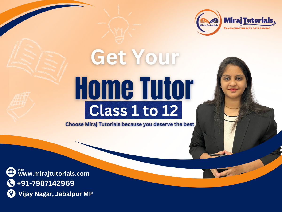 Every student has the potential to excel, but becoming a good student requires more than just attending classes and memorizing notes. It takes discipline, focus, consistency, and the right guidance. At Miraj Tutorials, Jabalpur, we understand that every child learns differently, and that is why our home tuition services are designed to provide personalized learning that helps students build strong academic foundations and develop the right study habits. With the help of our expert home tutors in Jabalpur, students of Classes 1st to 12th (CBSE, ICSE, and State Board) can not only score higher marks but also become confident, disciplined, and independent learners. Home tuition plays a very important role in shaping a student’s academic journey. In crowded classrooms, it is often difficult for teachers to give individual attention, which leaves many students with doubts and incomplete understanding. This is where Miraj Tutorials’ home tutors make a big difference. With one-to-one attention, customized lesson plans, and regular doubt-solving sessions, our tutors ensure that no student is left behind. By focusing first on building the basics and then moving to advanced concepts, we make sure students truly understand the subject instead of just memorizing it. This not only helps in exams but also in developing long-term problem-solving and critical thinking skills. A good student is someone who manages time effectively, practices daily, and stays consistent in their efforts. Our tutors guide students in following a proper study routine, preparing for exams with regular practice tests, and staying motivated to achieve their goals. The biggest benefit of choosing home tuition in Jabalpur with Miraj Tutorials is flexibility – students can learn at their own pace and get personalized strategies for subjects like Mathematics, Science, Social Studies, and English. Along with academic support, our tutors also encourage curiosity, build confidence, and develop discipline, which are the real qualities that make a student successful in the long run. Parents across Jabalpur trust Miraj Tutorials because we provide more than just academic coaching – we provide mentorship. Whether it is board exam preparation for Class 10th and 12th, improving weak subjects, or simply guiding younger students towards disciplined learning, Miraj Tutorials has the right tutor for every need. With modern teaching techniques, personalized attention, and result-oriented strategies, we ensure that students not only improve their grades but also become smart learners for life. So, if you are looking for the best home tutors in Jabalpur, Miraj Tutorials is your trusted partner. With our dedicated guidance and your child’s determination, becoming a good student is not just possible – it becomes a habit.
